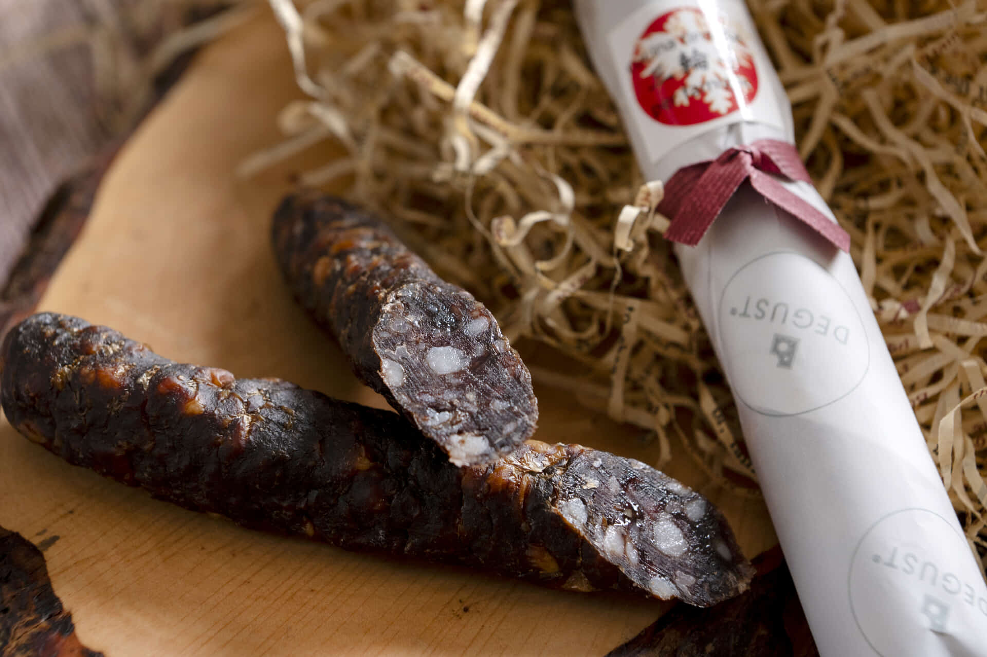 約1か月熟成の「燻製サラミ」、長崎県対馬産の猪肉で作ったしっとり食感の細い南チロル伝統サラミ「カミンヴルツ猪」です